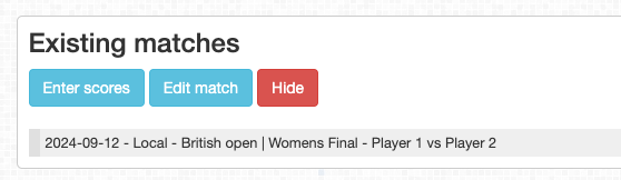 To start scoring a Match, select the match from the Existing matches list and press [Enter Scores]