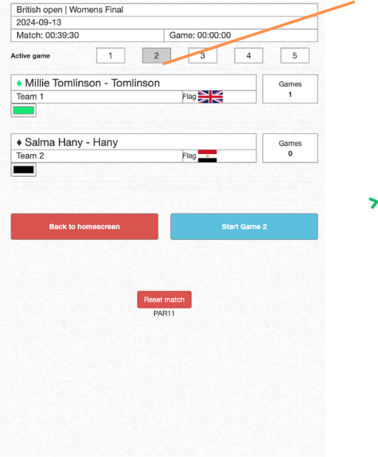 Next game tapped and can be started with the [Start game 2] button. Game 2 active after tapped at end of game 1. Start game 2 when players are ready to start game 2.